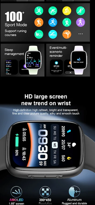 Stay connected with Bluetooth 5.3, voice assistant activation, and full call functionality. Monitor your health with 24/7 heart rate, sleep, blood oxygen, and stress tracking, plus smart alerts and reminders. With support for 100+ sports modes, automatic activity recognition, and advanced fitness metrics, it's your all-in-one training partner.